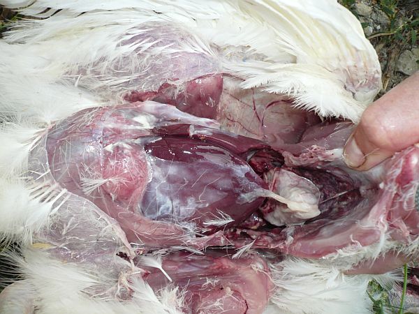 Например, прилагаю снимки "спящей" индейки больной колибактериозом. На вскрытии отчетливо видно проявление данной болезни.