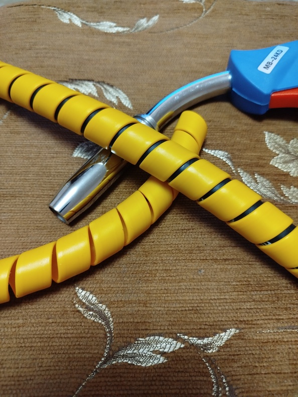 Пришла гофра"". Качество не Европа конечно - немного тоньше и края меньше закруглены, но и цена в 3 раза дешевле. Диаметр идеально подходит. Цвет до же когда испачкается всеравно будет яркий - что бы в маске видеть и не наступать на него, хотя в нем и наступив ничего не будет. Наматываю с зазором между витками 3-4 мм что бы эластичность на изгиб было лёгким.