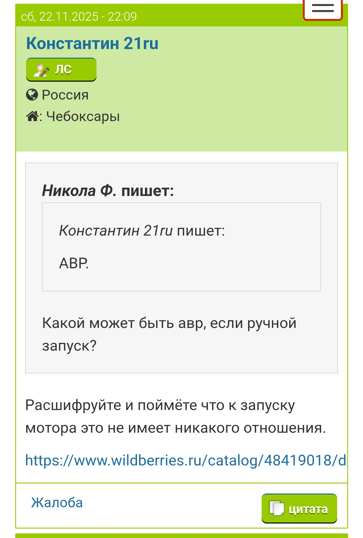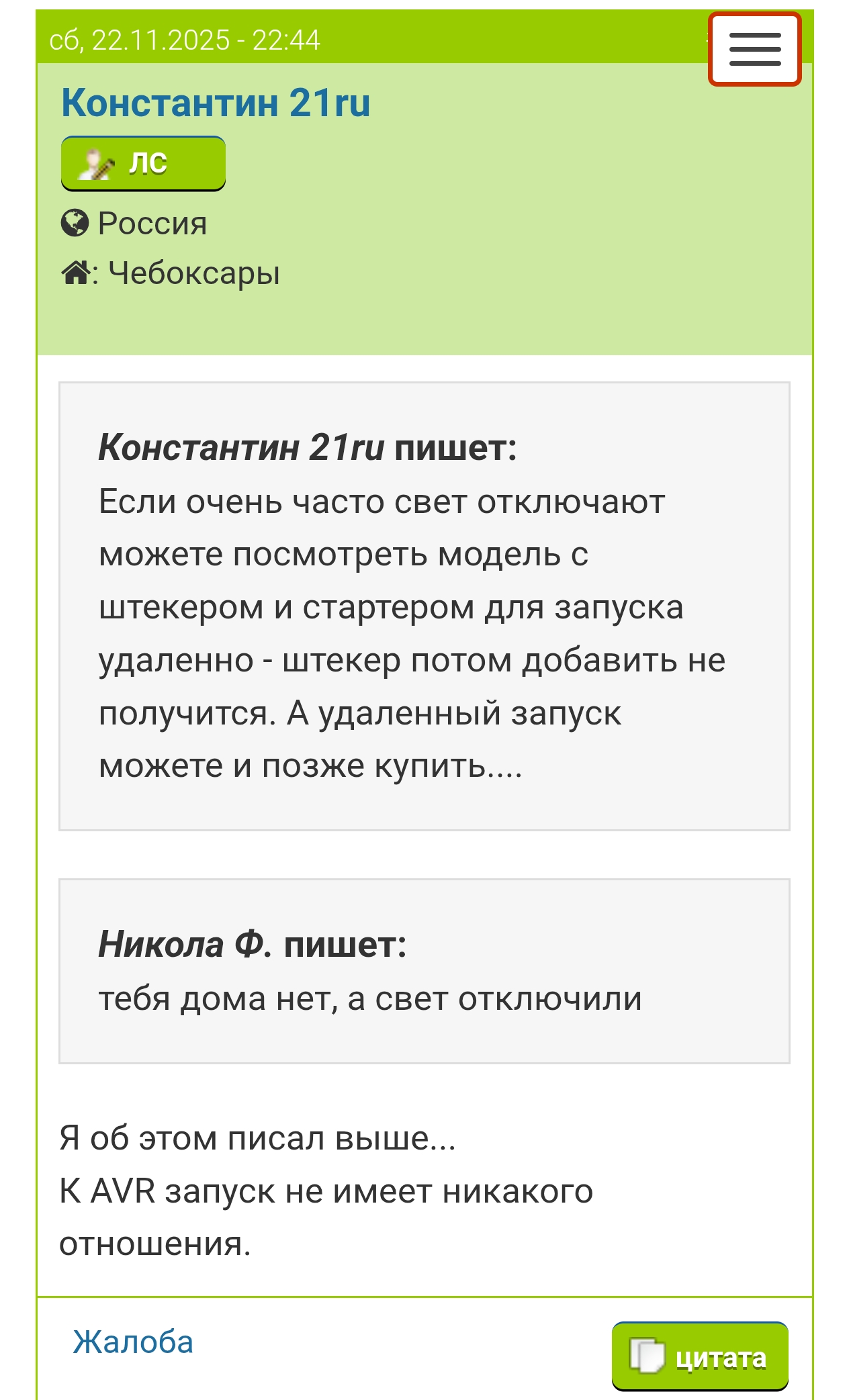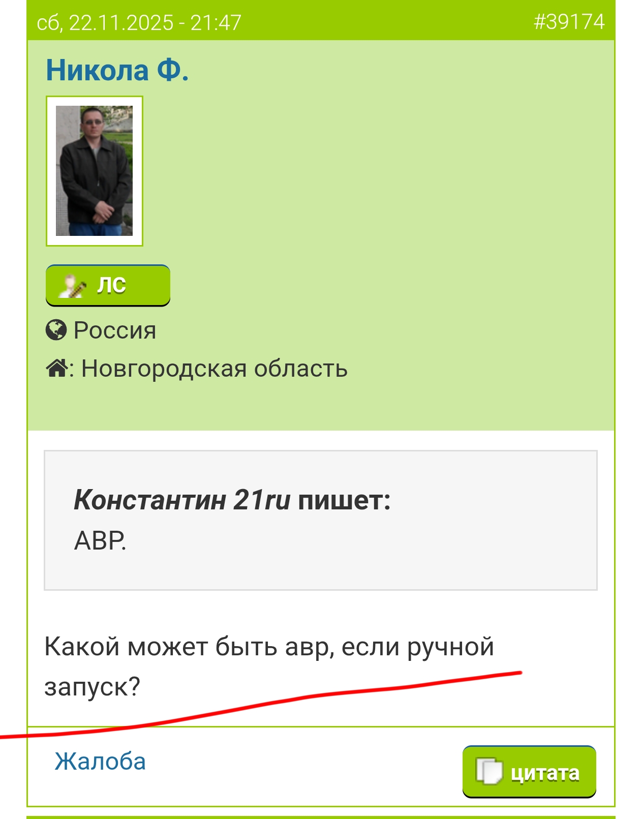 А ниже мы видим, ты же предполагаешь что придётся потратится на удаленный запуск. То есть это предполагает возможность запуска генератора не приближаясь к генератору. Правильно? Правильно! А дальше что? Пусть молотить в холостую без подключения к потребителям? Или нужен какой то прибор, который отключит дом от сети и подключит к генератору?! АВР (автоматический ввод резерва) может нужен? Вот поэтому твой текст и подразумевал понимание написанного тобой АВР, что это с большой долей вероятности автоматический ввод резерва.