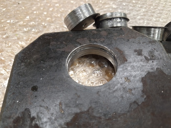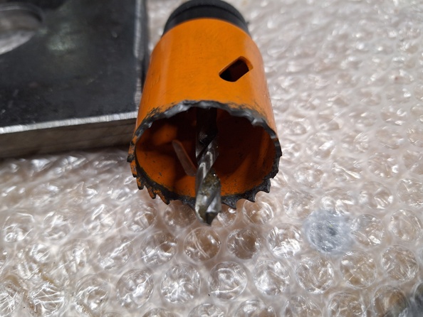 Биметалл не выдержал и 1/3 отверстия,добил твёрдосплавной с другой стороны.