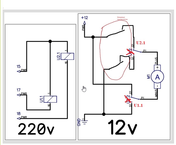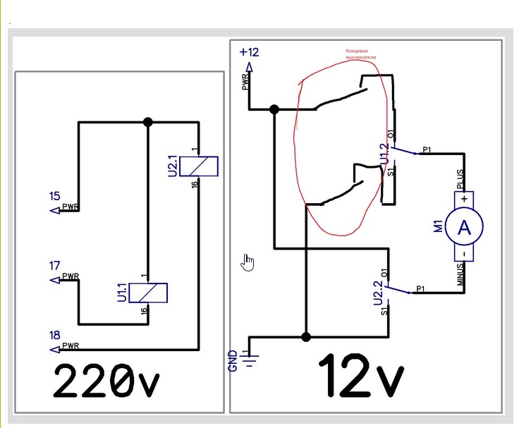 Спасибо.. Почему то у меня не правильно работает.. Я собрал вот по этой схеме на мотор редукторе на 12 вольт с концевиками , где ошибка ? Можете правильную схему скинуть ?