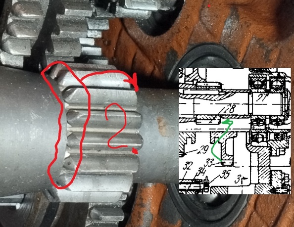Ведущая шестерня первой передачи (на фото обозначил двойкой) имеет с двух сторон скругление для входа в зацепление с другой шестерней или с одной стороны?