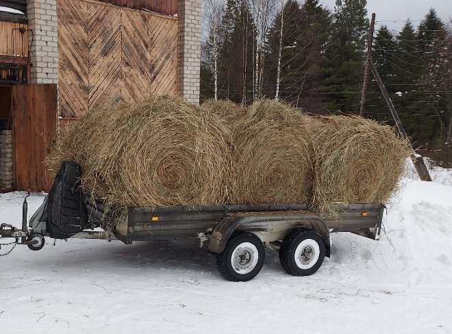 По три рулона на легковом прицепе. Погрузить можно и в ручную по доскам
