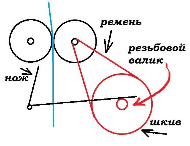 Вальцы. Меж ними сетка. Взведённый нож, опирается ножевидным упором на резьбу валика. Валик приводится от вальца подающего сетку.