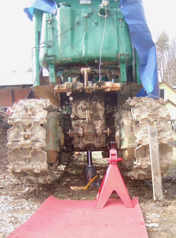 Сегодня занимался экскаватором (ЭО-2621), до Т-54 руки толком не дошли, но хотел проверить, подходит ли домкрат и подходят ли подставки. Чтобы сзади подлезть, пришлось сначала снять "оглобли", там все ржавое и изношенное конечно. Масленка на оси смазки не видела пару десятков лет :( С подставками я к сожалению лоханулся, брал на 12т, чтобы и под экскаватор с запасом хватило (он весит где то 6.5т), а они слишком высокие! Домкрат кое как под мост влез, а подставка уже никак не помещается, придется покупать версию поменьше.