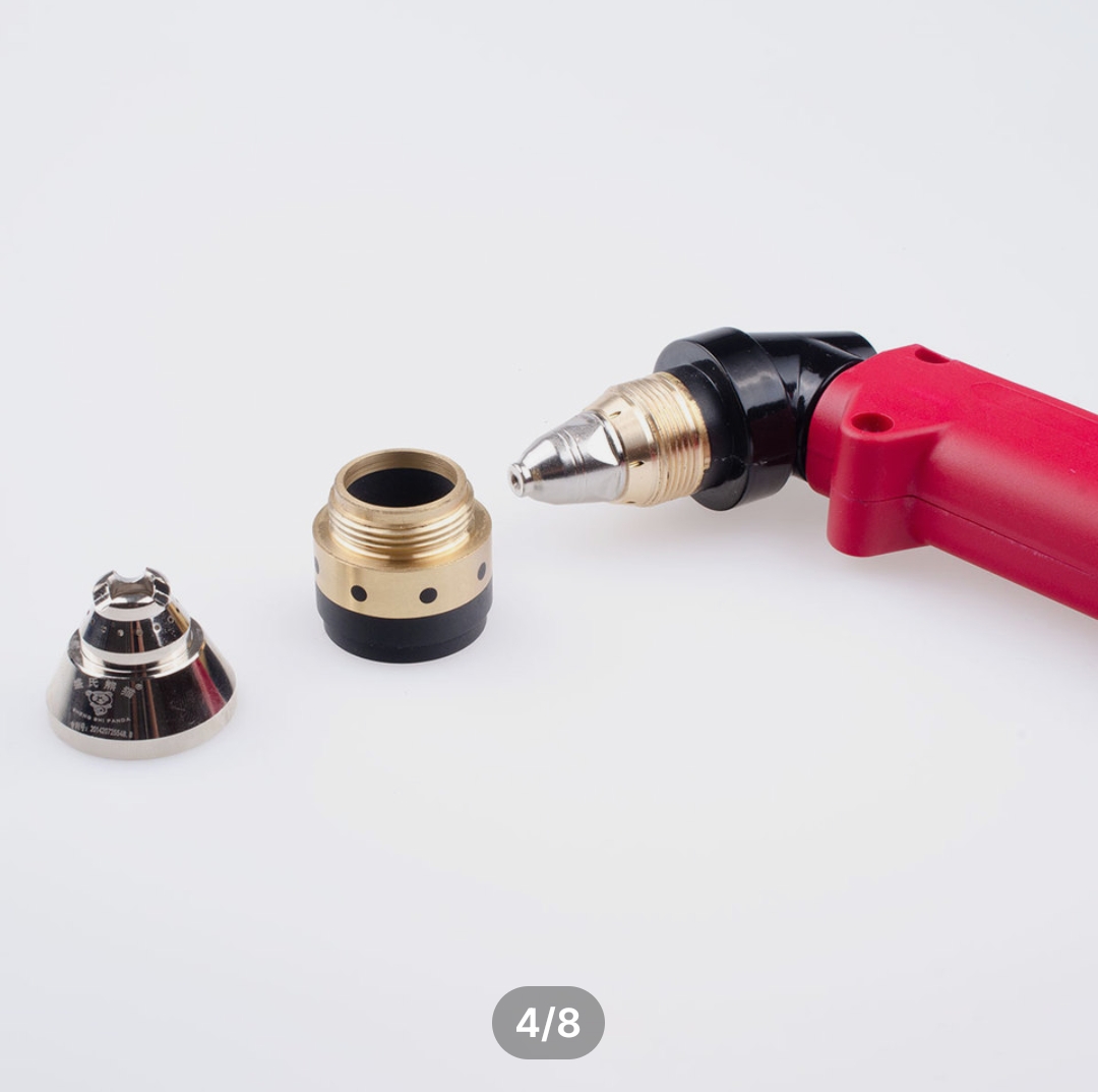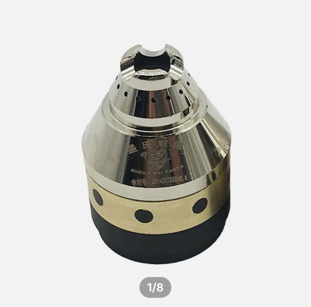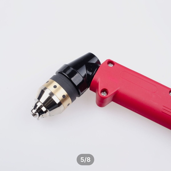 Попался такой интересный защитный колпак на плазморез Р80. Накручивается вместо керамической "юбки". Закрывает сопло полностью. Версия для ручного использования имеет дистанционные выступы. То есть можно опирать этим колпаком на разрезаемый металл. Своего рода замена колёсикам и проволочным приспособлениям для опоры на металл.