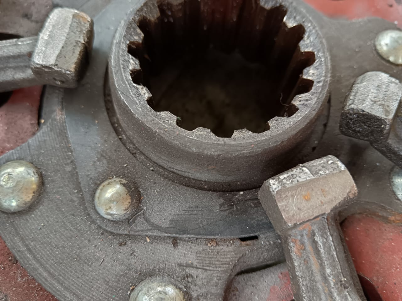 Поставил другую корзину сцепления, новый диск. На выжимной и вилки не стал смотреть. Заказал у токаря оправку сцепления. По ней выставил лапки на 12 мм. собрал. Из лючка попытался настроить свободный ход выжимного 3 мм. Укоротил тягу, не хватало для настройки. На заведенном тракторе передние скорости включались с начальным скрежетом шестерен. Поездил совсем немного, заглушил, в лючок сунул руку и почувствовал горяченный выжимной, хотя зазор было видно. Завел, снова включил 9 скорость и в момент отпускания педали сцепления услышал металлический скрежет. Затем полностью пропало зацепление. Еле-еле включил 1 скорость и доехал, раскатил его и увидел, что 1 лапка в середине сломана. на других расстояние разное.