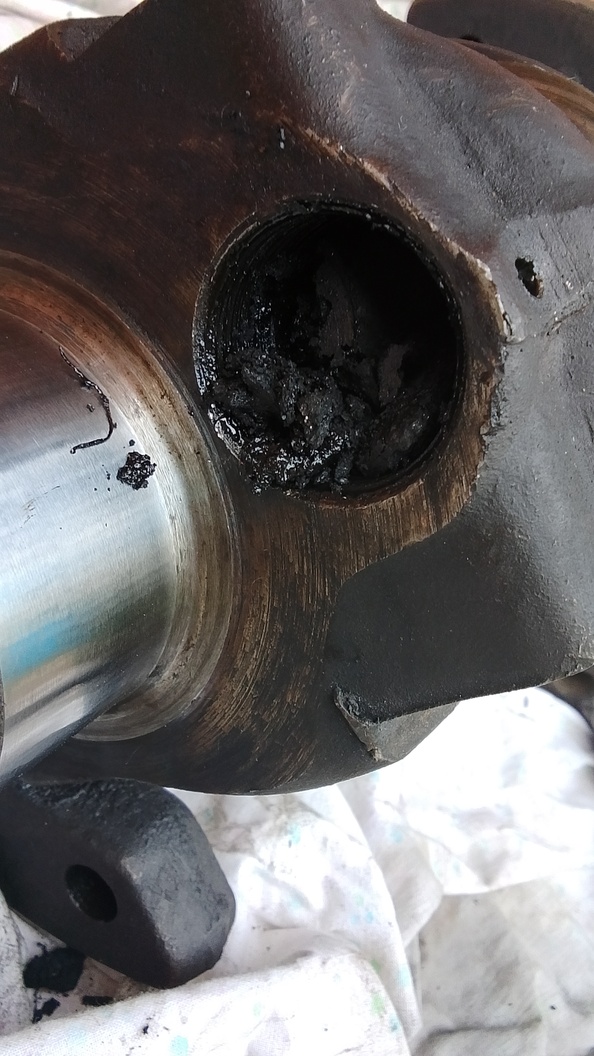 Вот такая гадость находилась в шатунных шейках коленвала. Д 144 чрезвычайно выносливый, не работающая забитая центрифуга, забитые шейки коленвала, а мотор работал давление 2 на горячую. При этом коленвал практически не износился!! Можно было и не точить, но я расточил. Коренные получились 2 номинал, шатуные 1ремонтный.