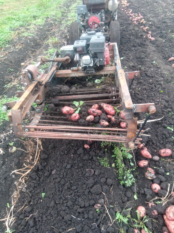 сажаем примерно 10 соток картошки. Самодельная грохотная копалка. С ней в разы быстрее чем руками копать.... картошка которая лежит на земле собрать недолго. Про лапу... сосед взял на пробу приспособу для лебедки, проехал один рядок и плюнул. Сказал лучше мне заплатит, но только выкопай ее. одно удовольствие картошку собирать если она еще и крупная и много ее)))