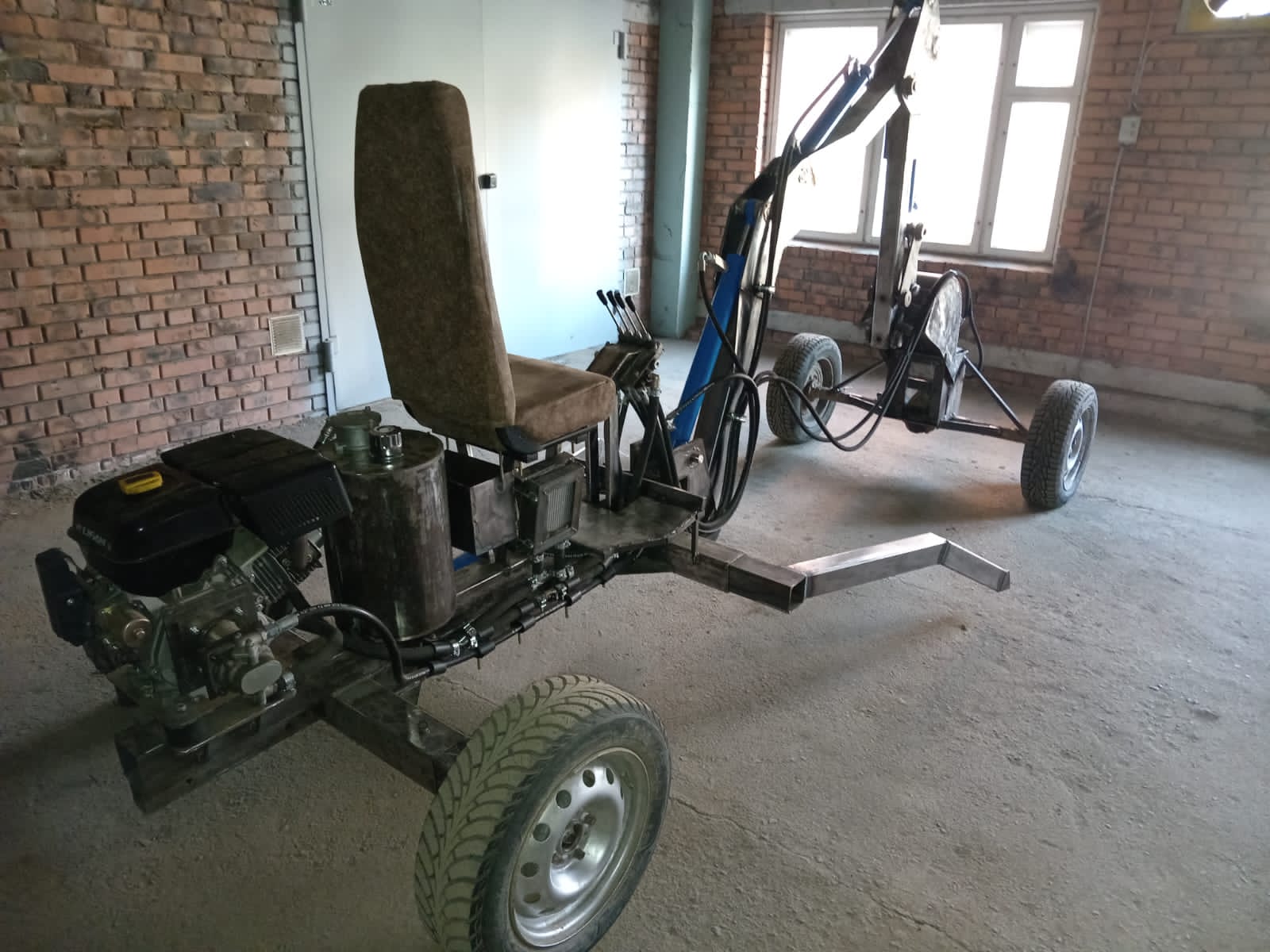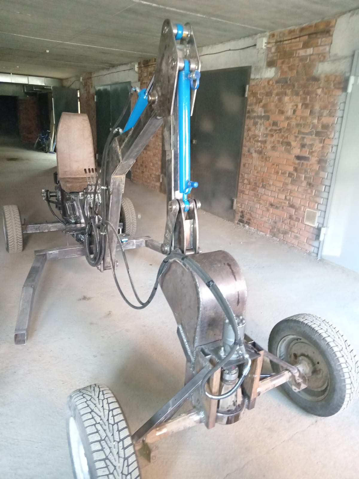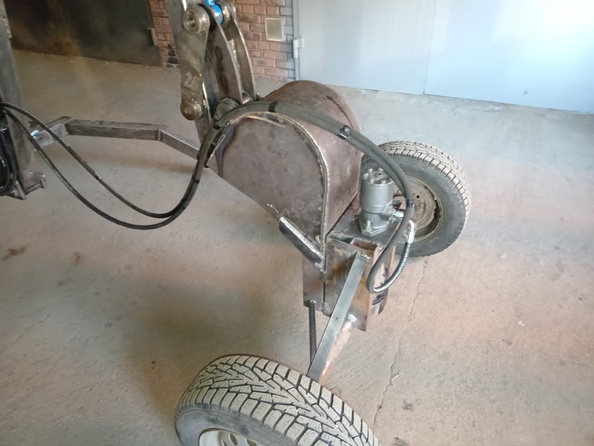 Принцип: на мост гм и шланги с быстросьемом. Паз на мосту под ковш. То есть мост на земле и в него в паз ставлю ковш и 2 шплинта. Гидрошланги от гм на быстросьемах на шланги от гц ковша. Ну и поехали. Рулить поворотом стрелы. Сибестоимость: мост 8500. Токарь. 500. Гм 10000. Переходник на гм 2500. Шланги , штуцера и быстросьемы 5500. Металл и колеса были.