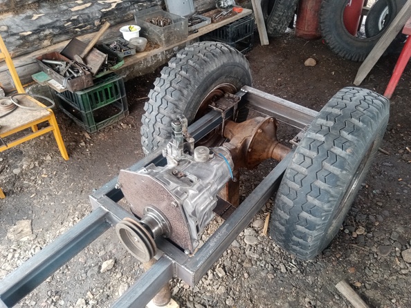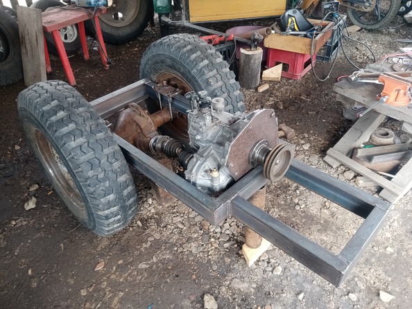 Привод останется под полом,слева место под педаль сцепления,справа места больше под две педали.Раму варить двухуровневую ,передние колёса на 10 ,максимум с того же Матиз.Есть рулевой редуктор ВАЗ и рейка 08. Сцепление ременное. По моим подсчетам скорость 4,06 км\ч при 2000 об\мин. двигателя Соответственно со шкивами 2\1 - 2 км\ч. Вот бы ещё редуктор Муравья для реверса. Концепция такая! Жду помидор!