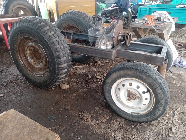 Продолжаю сборку. Сварил раму из двух секций. Колеса будут с Оки, и чтоб не тёрлись об раму, решил сделать так. Лонжерон для КПП на месте.