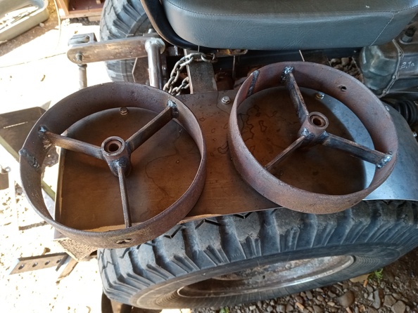 Изготовил за три дня окучник для мини трактора. Опорные катки полностью самодельные. Ширина 5,диаметр 22 см.