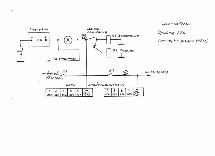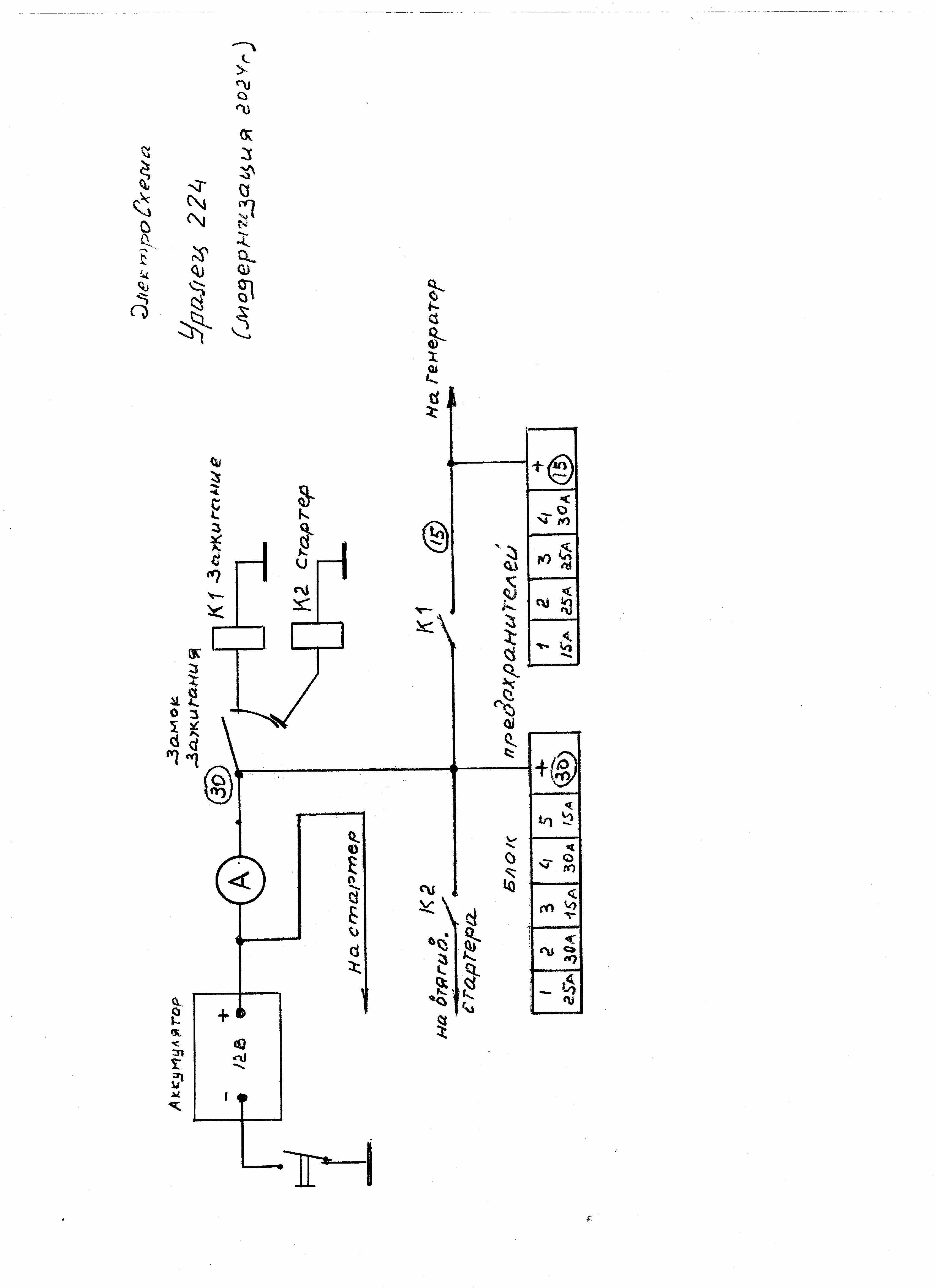 Спасибо Valan за замечание. Привожу откорректированную схему. Фактически так было и выполнено на тракторе при модернизации электросхемы. К стартеру и не добирался - там нужно было предварительно гидронасос снимать. Просто отходящие на замок зажигания 2 провода использовал. В начертании схемы допустил ошибку.