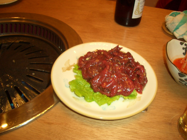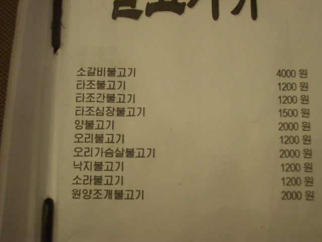Блюда из страусиного мяса также пользуются популярностью и в ресторанах. На фото вы можете увидеть наряду с блюдами из говядины и утки блюда из страусиного мяса. Это "пулькоги" (буквально - "огненное мясо") из страусиного мяса, печени и сердца. Цены на блюда прилагаются (2-е, 3-е, 4-е по списку).