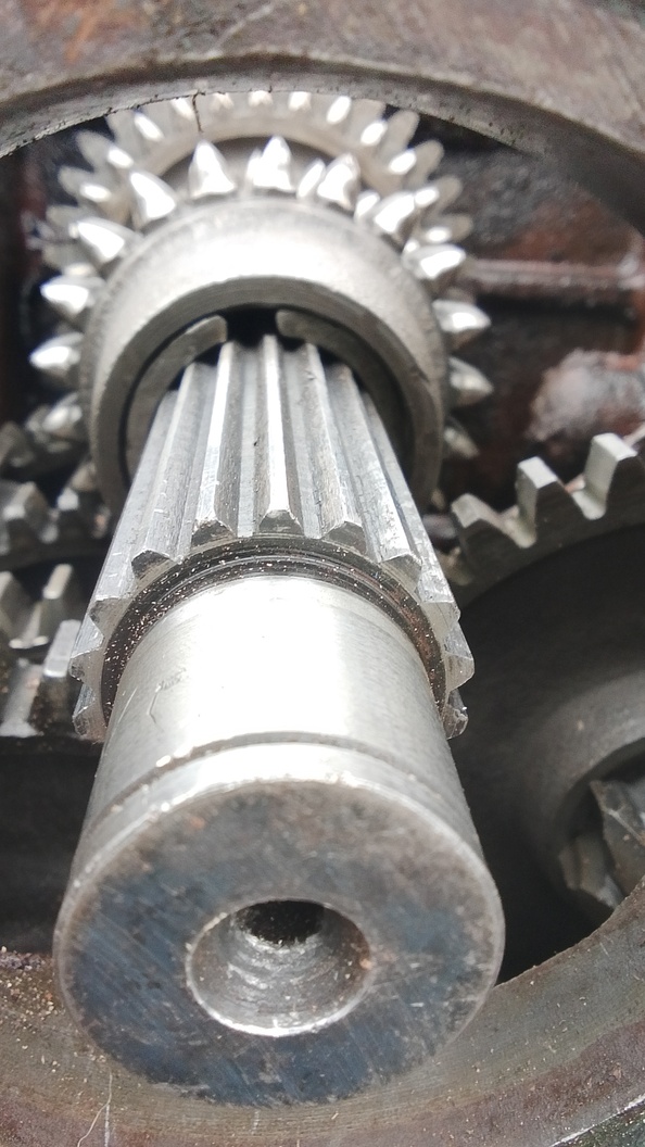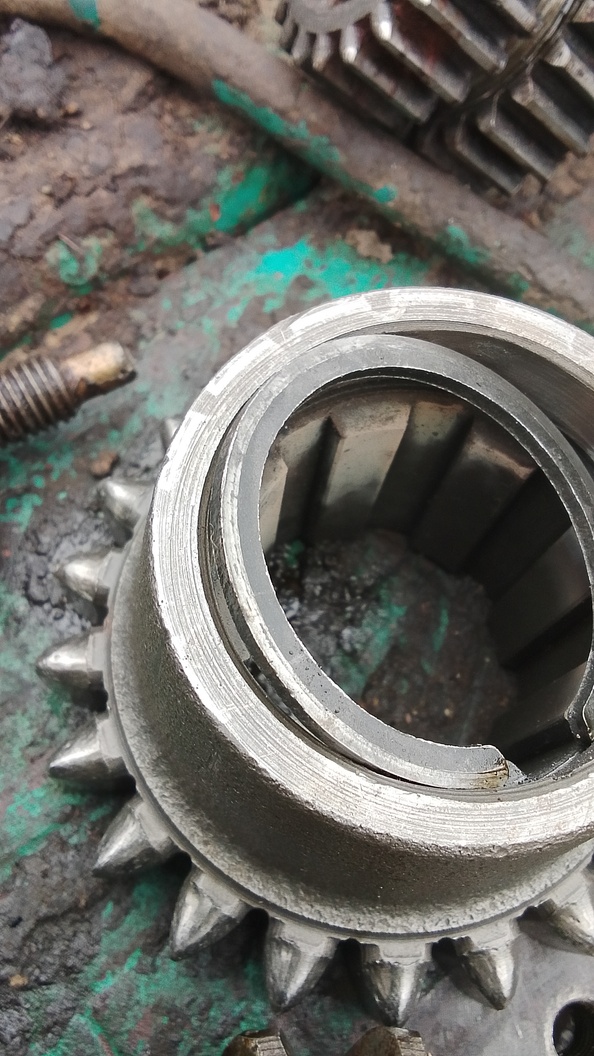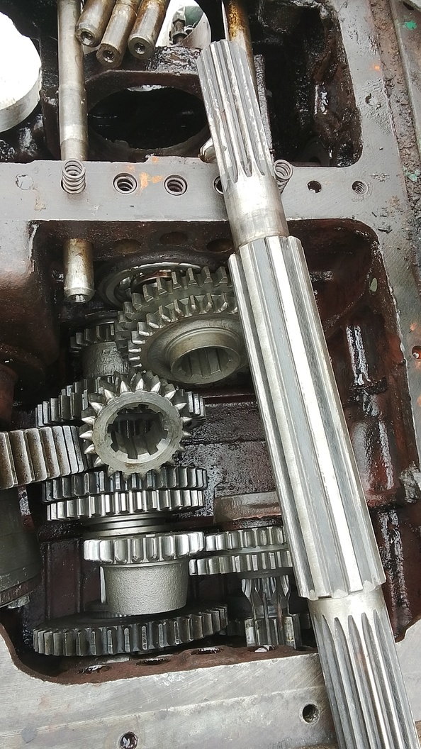 По первичному валу, всё собирается легко и быстро, если бы не шестерня 4 передачи, со стопорным кольцом внутри... Это кольцо нужно снять, а делать это крайне неудобно, кольцо уродское без ушек, без отверстий, без скосов... Короче его надо выковырять как нибудь.. Если его не снять не получится завести вал в КПП. Напомню я собирал КПП без раскатки с минимальным разбором трактора, ведущая шестерня реверса не трогалась.