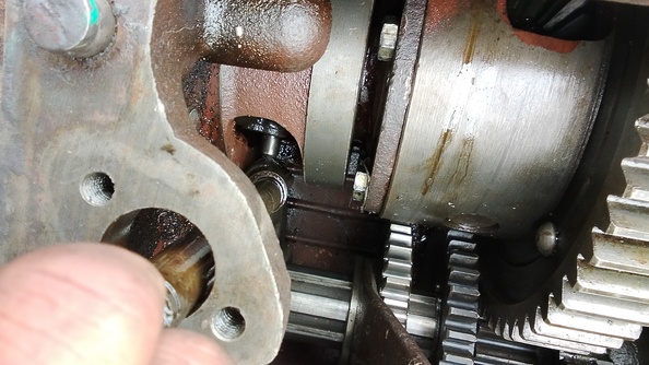 Сборка правого чулка с блокировкой. Муфту блокировки вставляем в вилку(вилка стоит в стакане подшипника), и ставим её в положение блокировка включена, зубья муфты блокировки вошли в зацепление с корпусом дифференциала, тем самым муфта блокировки отцентровалась относительно шестерни полуоси - полуось легко войдёт. Что бы муфта не вывалилась - когда будем" пихать" полуось. Вилку можно зафиксировать со стороны коробки - на фото у меня зубило.стави крышку с сальниками 65х45х10, 2 сальника, можно поставить 1 65х45х10 и 2 65х45х8, посадочного места чётко хватает на три сальника такого размера. . Ставим бортовую с чулком в сборе. Потом через верх легко вставляем шток включения блокирлвки, пружину и направляющую втулку. Напомню шпильки крепления чулка на т 40 подходят от КамАЗа м 18-2, 5-м18-1, 5.есть и ремонтные на случай если отверстия в чулке разбиты. При установке шпилек, нужно быть внимательным, отверстия с резьбой сквозные в районе КПП, шпилька может не дать включить замедленную, если будет сильно торчать. Резьбу в корпусе прогоняем мечиком м 18х2, 5, обезжириваем, мажем фиксатором резьбы, гайка м 18х1, 5 с нейлоновым кольцом.