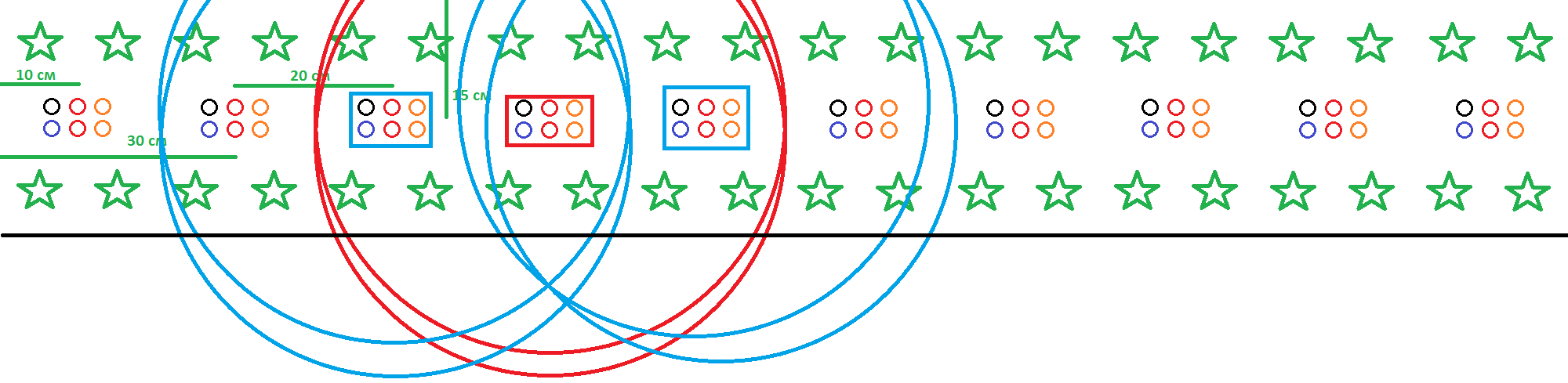 Вот вроде сделал схему ) Если угол рассеивания у светодиодов брать 120 градусов, то при высоте подвеса в 15 см пятно будет диаметром 60 см. Чёрной полосой выделил где будет находиться стенка со светоотражающим материалом, сверху она понятно думаю где Красным и Синими квадратами выделил модули, от которых расчертил окружности с диаметром в 600 пикселей (в переводе на масштаб рисунка будет 60 см). мб что-то не так понял, световое пятно конечно больше перекрывается, чем на 25-40% но если такая схема будет рабочая, то меня это устроит