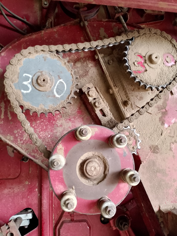 Я верхнее решето открываю так что бы через него не проходил "ёжик" дурнишника. И этот размер совпадает с заводским установочным 12-14мм. На закрытое нижнее насыпаю горсть семечек и затем понемногу его открываю. Как семечки начали просыпаться через него, оставляю в этом положении. Пробую молотить и походу корректирую. Обороты барабана 260.