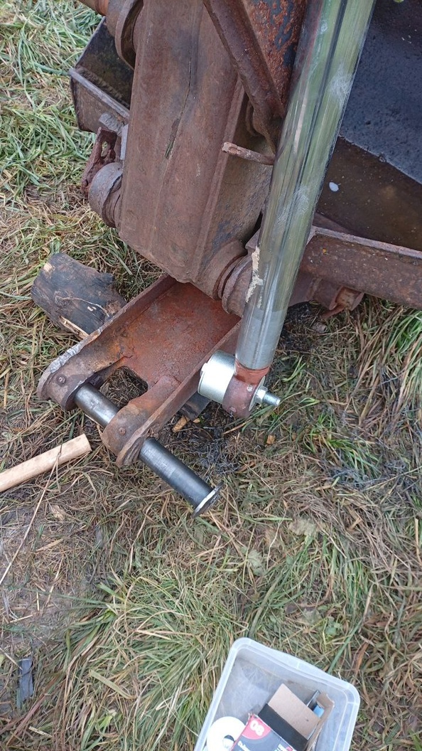 Так это не сложно поправить. На эту тягу со стороны шляпки болта одеваете тягу трапеции. А цилиндр с наружной стороны правого уха. Ковш упираете в землю и втягиваете шток шилиндра. После каждой попытки проверяете и корректируется свои действия. У меня на южане в этом месте стояла полуось от газона.