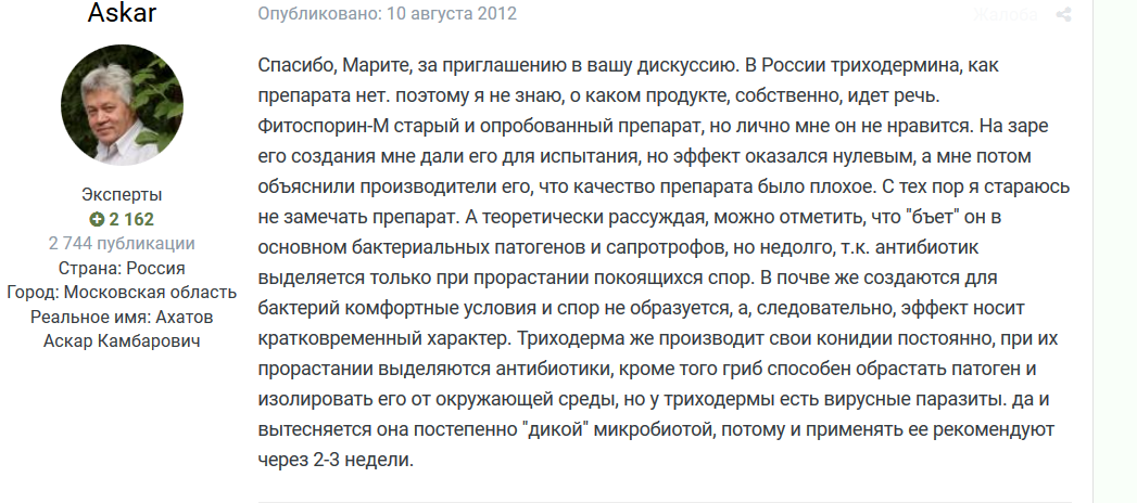 Вы не так поняли текст Ахатова. Он не сравнивал Триходерму и Фитоспороин, а только выделил, что как препарат Триходерма местного производства у него вызывает сомнения. Это и фактическое соответствие титра спор заявленному производителем и качество маточной культуры препарата у производителя и т.д. А так , теоретически споры триходермы прорастая выделяют антибиотик (по аналогии с другими био).А мицелий триходермы , захватывая источники питательных веществ, этим препятствует другим компонентам микробиоты(в нашем случае это фузариц и вилт в первую очередь) осваивать обьем субстрата корневой зоны растения. Ну в общем польза есть, но ожидания от их эффекта зачастую очень переоценены. Я вот на своих баклах Триходерму (в виде таблеток Глиокладина от Агробиотехнологии ,РФ) сую начиная с рассады, затем в лунку при высадке на ПМЖ, затем через 20-25 дн повтор в корневую зону, затем еще раз в корневую зону баклов. Ну ,в итоге на поесть урожай набираю, но не больше. Душат болезни увядания все равно. Так и хочется врезать по корневой беномилом,уложил бы увядания на лопатки, но ведь (гад) почти 2 года в почве разлагается. Вот такие вот дела про сказочный эффект био.