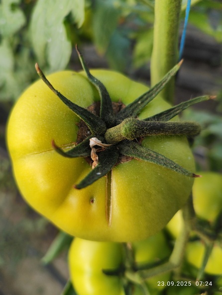 Рвет характерными радиальными трещинами. Это уже не раз тут обсуждалось. Причина - раннее образование большого ореола вокруг плодоножки еще на зеленых плодах. Ореол (в виде коричневого круга отчетливо виден на фото). Считается , что если ореол образовался рано(на фазе налива плода), то к моменту созревания такой плод обязательно треснет радиально. Способствует этому образованию ореола-дефицит бора или перегруз куста плодами.